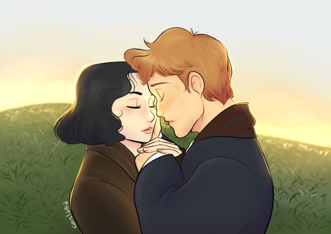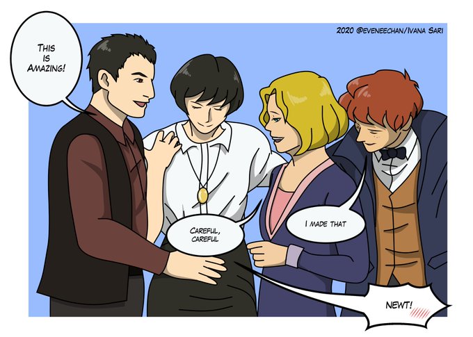 Got inspired from iconic Ezra, Alison, Katherine, and Eddie's photo and redrawing it as FB characters: Credence and Queenie welcoming Newtina's baby