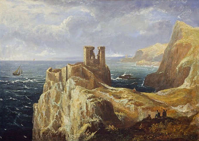 Fast Castle, Borders (Scotland) watercolour reconstruction suggestion from 1987. Changed it when I found Hall machicolations led to a Keep which makes more defensive sense. #FastCastle #ScottishCastles #HistoryRebuilt #watercolourpainting