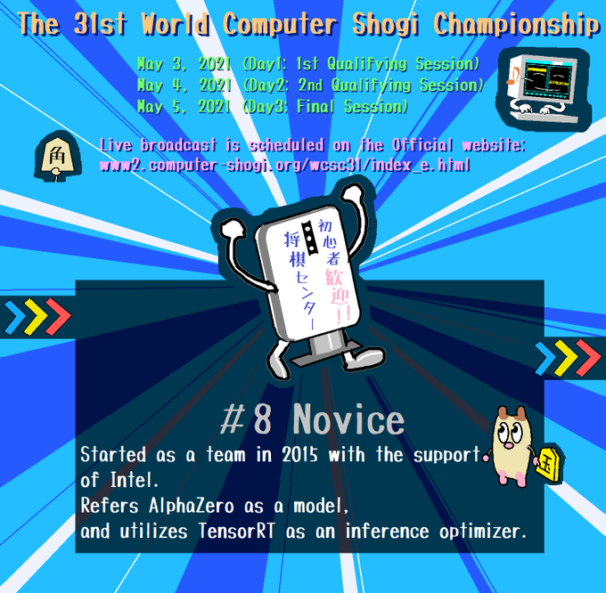 ここは分業のできているチームだな(^~^)やねうら王系でないのは PALとか Noviceとかで狙い撃たれないのが強み(^~^) #wcsc31 #shogi #computershogi #computergame #gamedeveloper #programming #gameprogramming #artificial_inteligence #AI #DeepLearning #intel #AlphaZero #TensorRT