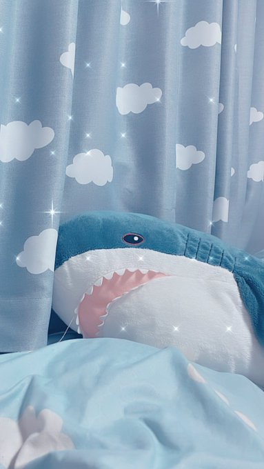 カーテンもお布団も水色なんだ🦈☁️