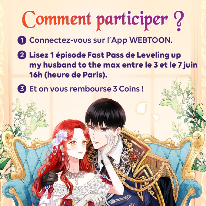 🚨 Bon plan WEBTOON 🚨 Attention aux fans de "Leveling up my husband to the max" ! Entre le 3 et 7 juin 16h, lisez 1 épisode Fast Pass de "Leveling up my husband to the max" et on vous rembourse 3 coins !