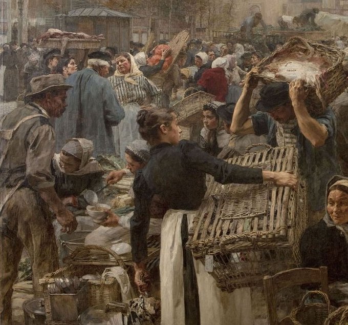 Les Halles (1895) by Léon Lhermitte (French, 1844-1925). Location of painting: Petit Palais, France. Émile Zola set his novel Le Ventre de Paris (1873) in this market.