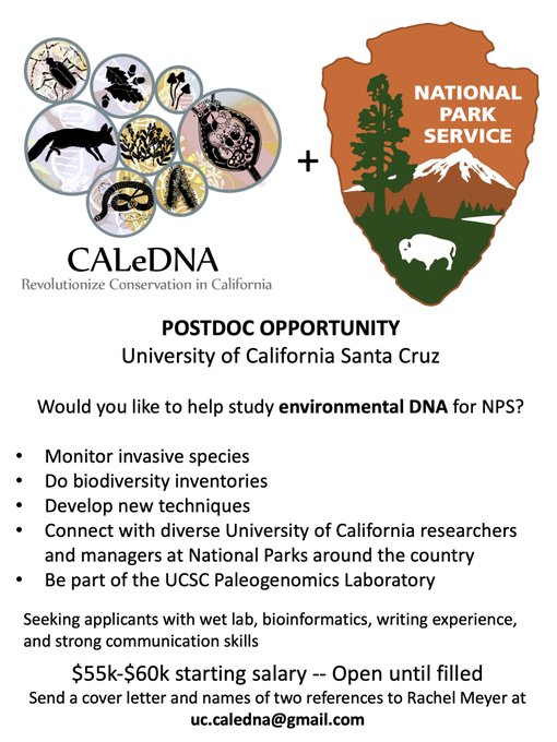 CALeDNA is hiring!!! Spread the word #environmentalDNA #NationalParks #eDNA #invasivespecies #biomonitoring #DNA #molecularbiology #UCSC