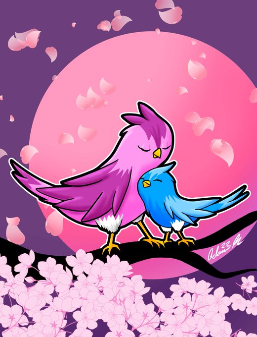 Two individuals are in a landscape filled with sakura flowers; it includes printed text that are hung on each rope from the upper left center of a double-sided shape of a border.