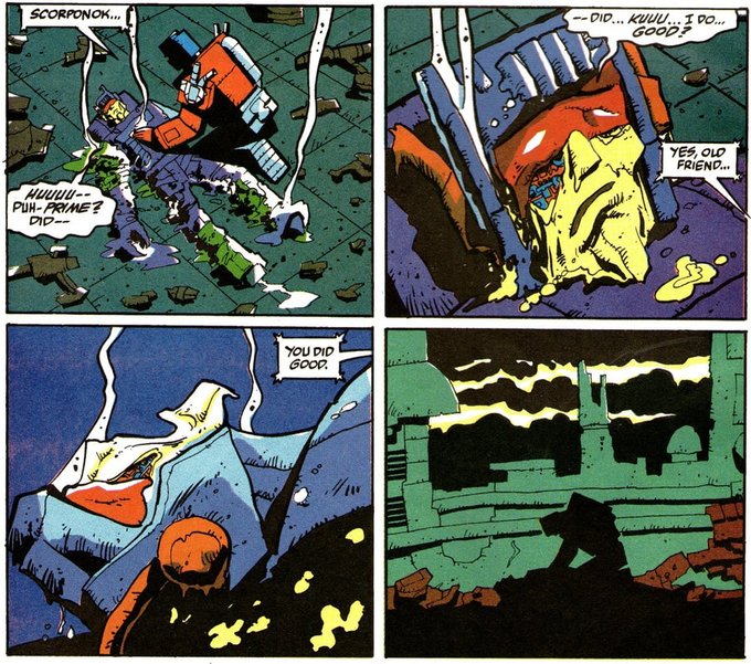 #MyFaveComicPage has to be a Transformers one, and this sequence - where Decepticon leader Scorponok has tried to save the world and failed - hit me very hard at an impressionable age. A sad, subtle moment from @SimonFurman3 and beautiful, horrible images from @geoffsenior4 https://t.co/sMnKTkt4Yx