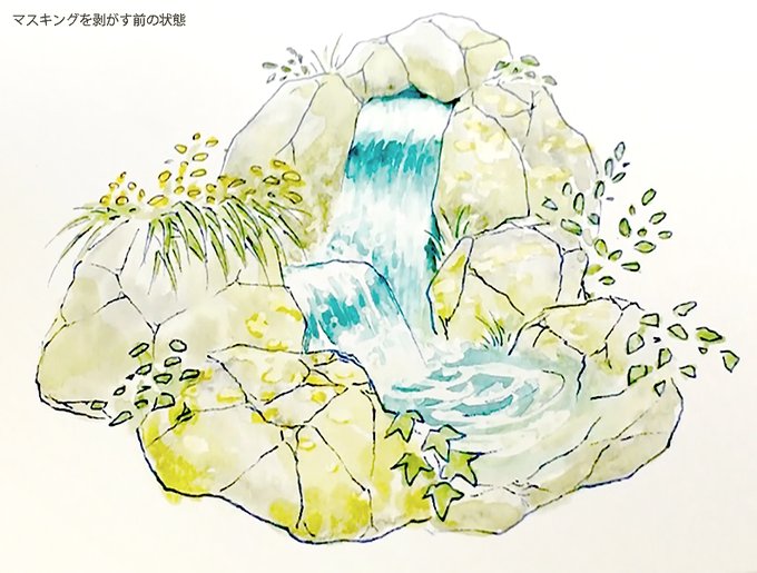 2つのマスキング液を使って滝を描いてみました。