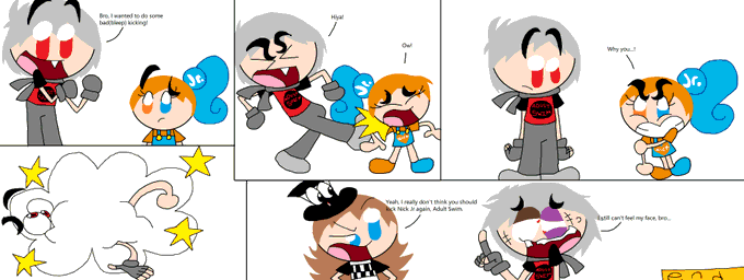 2001 Adult Swim (my version) wanted to do some kicking, so he kicked 2000 Nick Jr (my version) in the arm. And Adult Swim was beaten up by Nick Jr. #AdultSwim #NickJr #CartoonNetwork @adultswim @nickjr @cartoonnetwork