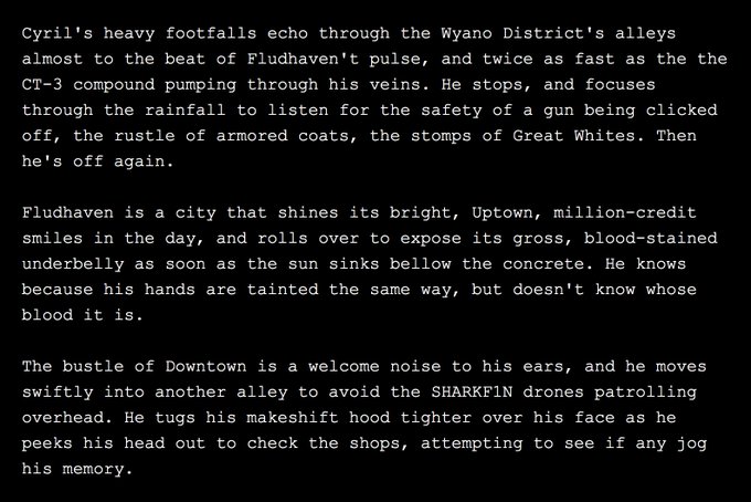 Aaron and Blank's world is v inspired by cyberpunk. I've written brief snippets here- the Cyril one is from a recent rp log, while the others are from last year while I was testing twine. I'll talk more abt it once I finish the aaronblank mv :3c