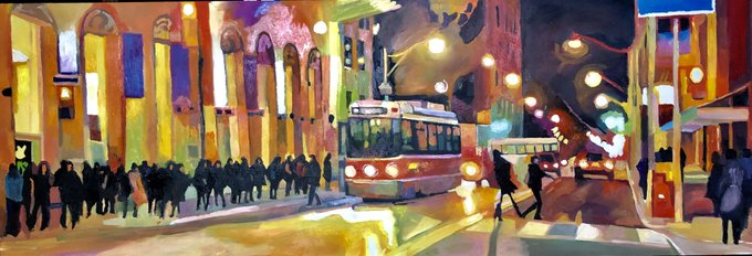 Layer 2. Queen and Yonge Rush Hour In December 2015. #TTC #Toronto #canadianart #oilpainting. One more layer to go.