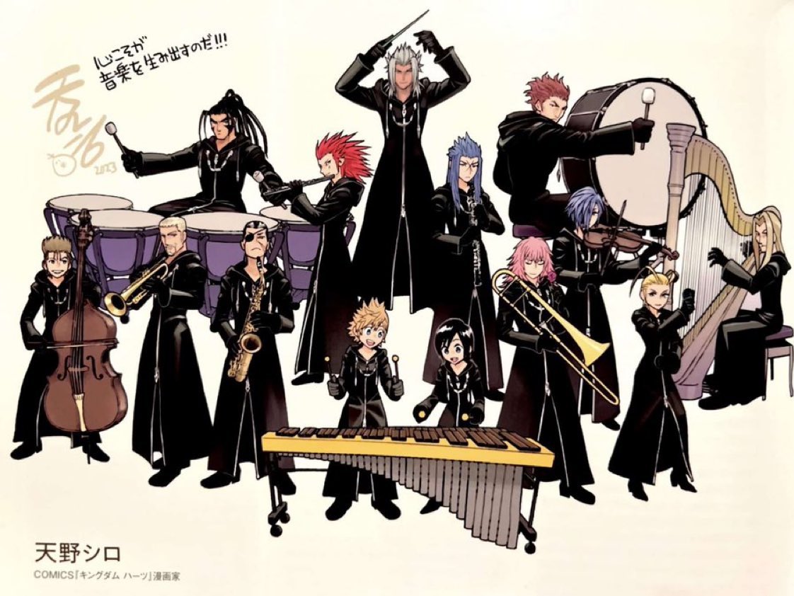 La Organización XIII formando una orquesta, cada miembro con un instrumento y Xemnas como director, hecho por Shiro Amano.