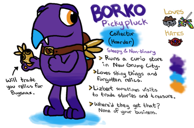 Introducing Borko!! My #Grumpsona, finally. They love shiny things, lore, and flying #Bugsnax.