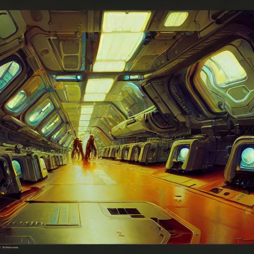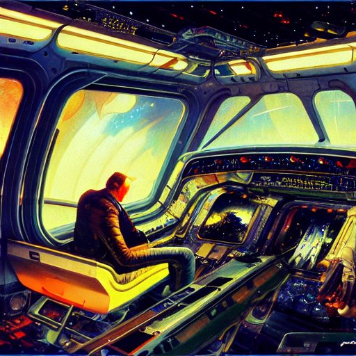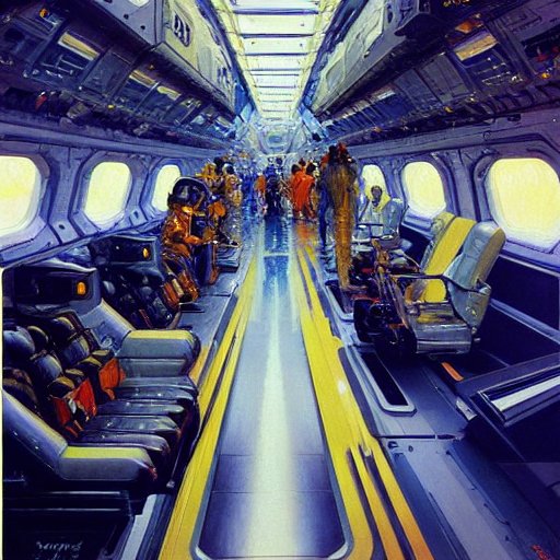 Retrofuturistic space shuttle interior, detailed intricate sci-fi oil on canvas by John Berkey James Jean Syd Mead J.C. Leyendecke Marc Simonetti Artstation