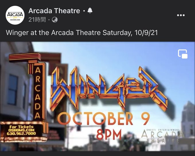 10月9日(土)イリノイ州🇺🇸セントチャールズ Arcada Theatre にてWINGERのライブです。午後8時(🇯🇵時間10日午前11時)より。