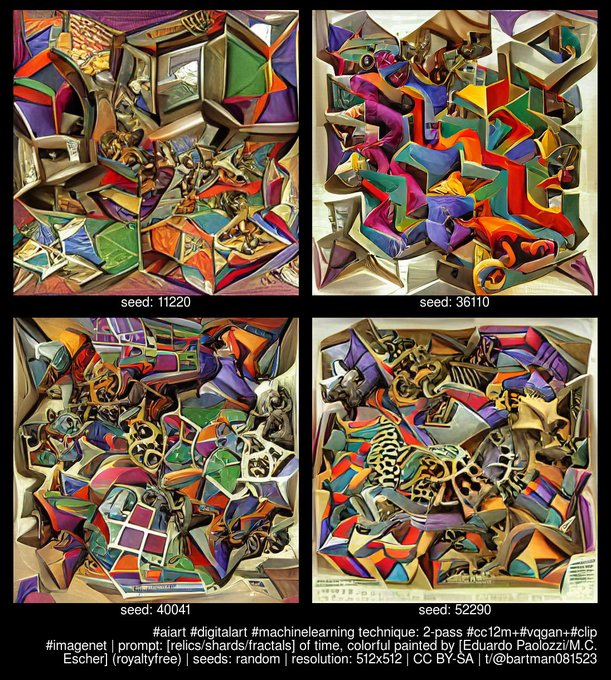 prompt: [relics/shards/fractals] of time, colorful painted by [Eduardo Paolozzi/M.C. Escher] (royaltyfree)