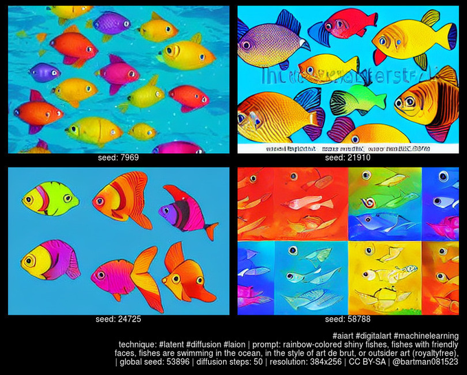 prompt: rainbow-colored shiny fishes, fishes with friendly faces, fishes are swimming in the ocean, in the style of art de brut, or outsider art (royaltyfree),