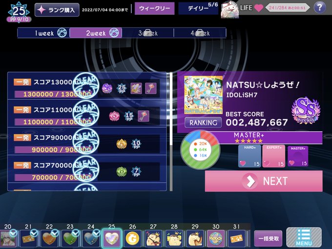続いて2022ナナパス6月第2週、ウィークリー曲はNATSUしようぜ。こちらも定常SSR縛り。縮小2(スキルマ)、判定強化2、判定ガード1で12%アップバッジ。基準ラインは同じく130万。