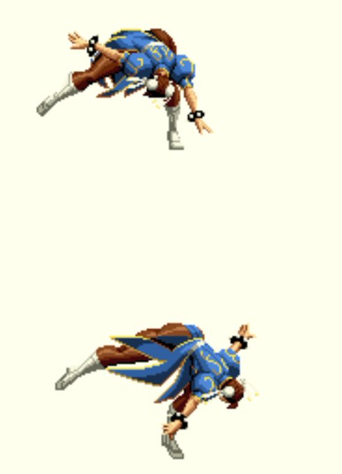 スト3、そのドットを元にしたSVC、マヴカプ3以降、タツカプ辺りは手すら付かずに体のひねりだけで回ってる