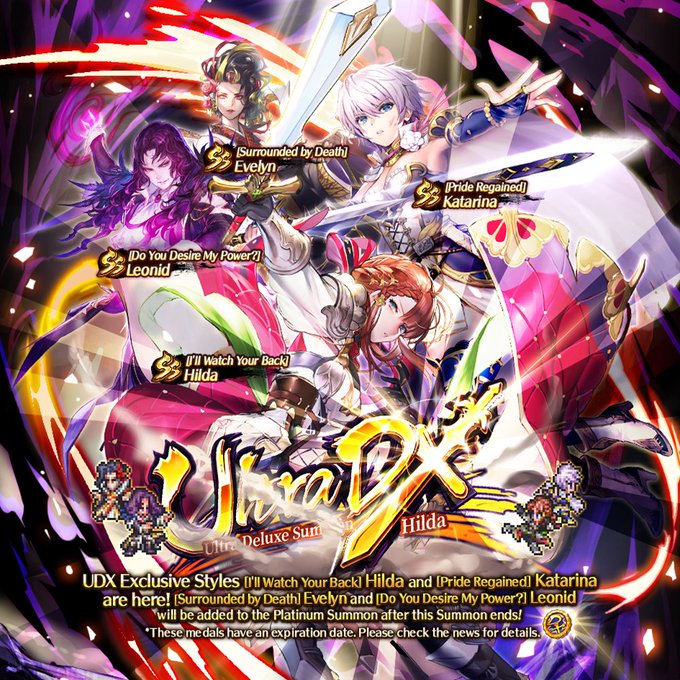 Add UDX exclusive Styles [I'll Watch Your Back] Hilda and [Pride Regained] Katarina plus SS Styles [Surrounded by Death] Evelyn and [Do You Desire My Power?] Leonid!