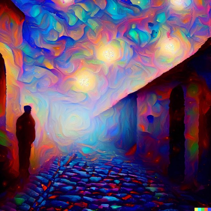 “The air was soft, the stars so fine, the promise of every cobbled alley so great, that I thought I was in a dream.” Jack Kerouac, On the Road (Psychedelic Painting) (Rule of Thirds) #dalle2 #dalle2exp #kerouac #digitalart #AI #literature
