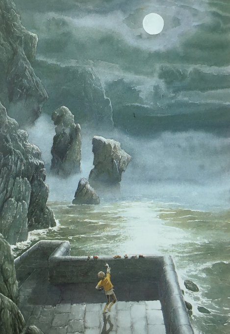 "The moon was blazing down at him with a face of fury. Its whiteness was all dirtied over, with marks where he had thrown his shoes. And he could feel its anger scorching him." The Moon's Revenge by Joan Aiken, illustrated by Alan Lee.