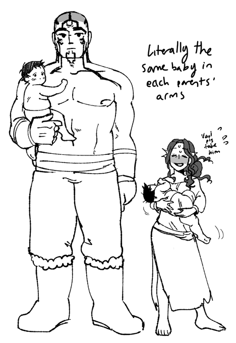 More doodles of me and my friends married PCs Vaul and Lin bc im lov them... they have a son who's a little over a year old (and already getting tht goliath growth spurt- 4th pic)