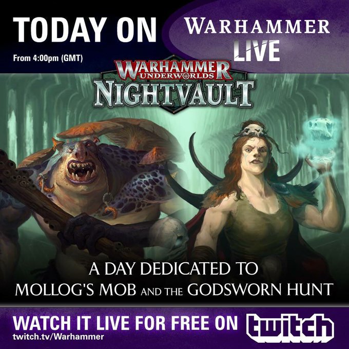 It’s all about Mollog’s Mob and the Godsworn Hunt on #WarhammerLive today! @DaveDaemonkilla will be talking about their rules at 4pm, the designers who made the models are on at 5pm, and then the warbands will fight in tonight’s battle report at 6:15pm! #WarhammerUnderworlds
