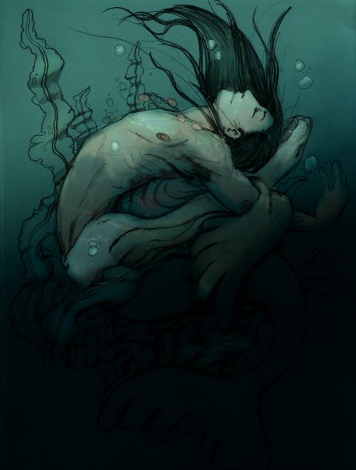A MERMAID'S TAIL prevented her from consummating relationships with humans; artists suggestively erased her tail. Waterhouse’s siren has scales from her calves down; in 1896 Munch’s #mermaid’s fishy tail starts at her knees & Magritte’s extends only to mid thigh #WateryFolklore
