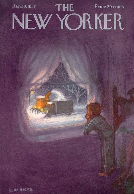 Edna Eicke, New Yorker covers, December 1952, January 1960. In 1953 Eicke and her family moved to Westport, Connecticut, which at the time was a small town of artists. She published a book of her covers, and illustrated three children's books. Info from: https://t.co/Ot5ihFkiT7