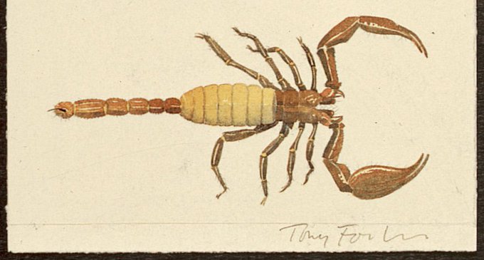 🦂Tony Foster has painted many wildlife specimens throughout his artist-explorer career. This scorpion was painted as a souvenir in Monteverde, February 1992🦂
