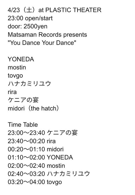 #YDYD0423 いよいよ一週間前となりました。タイムテーブルを公開させて頂きます。また、当日はPLASTIC THEATERのアカウントより配信をさせて頂くこととなりました。ご来場を心よりお薦め致しますが、遠隔の方は是非とも配信にてご覧頂ければと思います。宜しくお願いします。