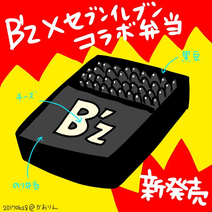 今朝フォロワーさんと話してたB’z弁当をイラストにしてみました。 おかずは黒豆、「B’z」という形のチーズをのせたのり弁。