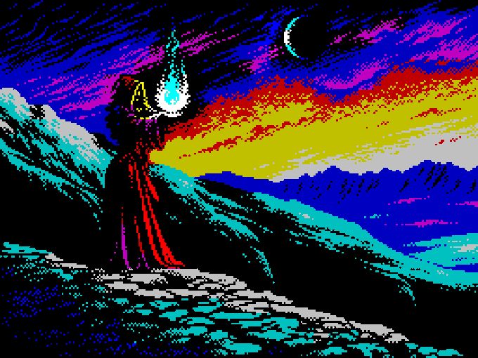 Telas de carregamento de Bruxólico: desenho a mão, escaneado e colrido no pc, pixel art de ZX Spectrum: