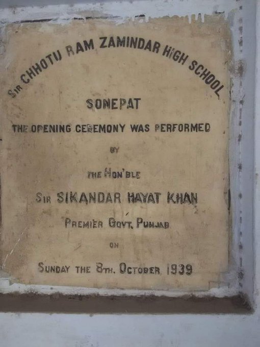 An old inaugurating tablet of High School in name of Sir Chhotu Ram Zamindar at Sonepat c 1939 (now Haryana) by then premier of Punjab, Sir Sikander Hayat Khan. Both of them belonged to Jat community & leading politicians of Unionist party of British Punjab.