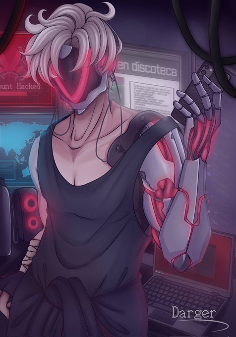 "Haku con brazo biónico Hackeando con una máscara de V de Vendetta"