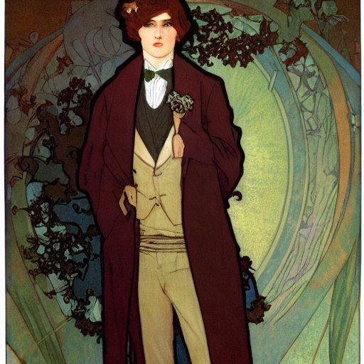 オッケーAIミュシャ先生! さっきの若いお姉さんを若いお兄さんにして!(シード値やパラメーターはそのまま、プロンプトの「female」を「male」にする)