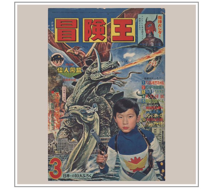 『冒険王』1967年(昭和42年)3月号 第一次怪獣ブーム終盤の頃。表紙、付録、連載漫画に怪獣ものを揃えている。注目は「魔神バンダー」作:井上智の扉絵で、映画ポスターに匹敵する迫力の構図と彩色が美しい。雑誌の全容はAmebaブログで。