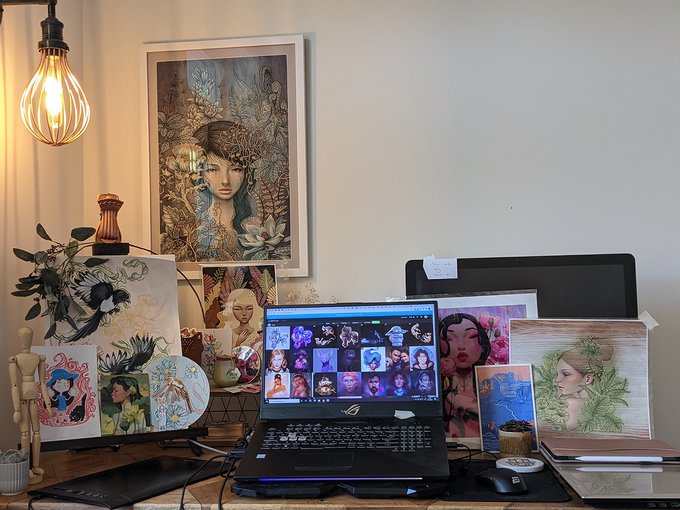 ✨The art Vs the work space✨I re-organized and tidied my space today for the first time in like a year or else it would be a mess!🤭I have a lot of stuff around me + a bunch of art supplies in a cabinet below the desk. You can see a lot of what inspires me💜 #artvsworkspace