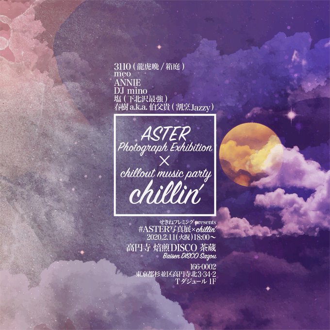!お知らせ! 来たる2月11日(祝・火) マイメン3110さんのChill outイベント「chillin'」 焙煎DISCO茶蔵で開催中のせきねフレミング個展 「#ASTER写真展 」 コラボイベント開催します👏🏻📸✨ 情報量の多い私の写真と、Chill空間。これまた良い化学反応が起きそうな予感。フラッとお立ち寄りください〜♪