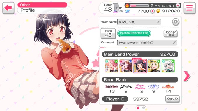 Hiya!! I’m Yuki who loooves Roselia and my best girls are Rinko, Tae, Chisato, and Kanon and I love them sm~♡ I’ve watched the anime before the JP server launched and I’ve been playing ever since its release and my love for Bandori has grown drastically since then!