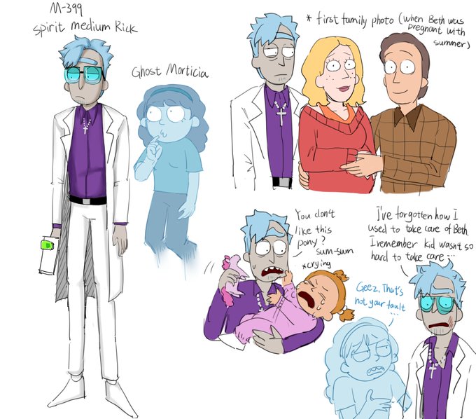 399 is younger than other rick. He found the ghost morticia and adopted her,and he volunteered to babysit for his daughter so Beth could continue to get her medical certification.#rickandmorty #birdrick