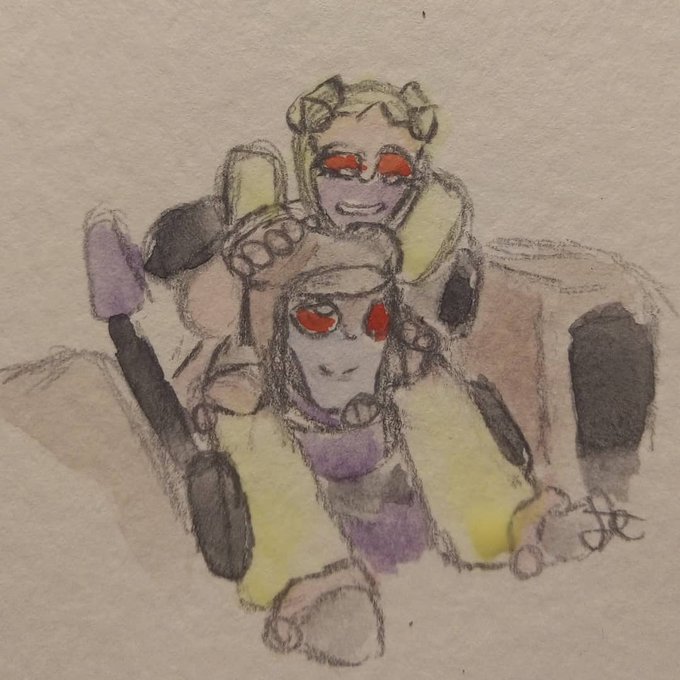 Do you guys like #TransformersAnimated Blitzwing ? I do. Here's a practice paint-y thing, a sketch from the Grindstorm comic, and a Blitzbee kiss.