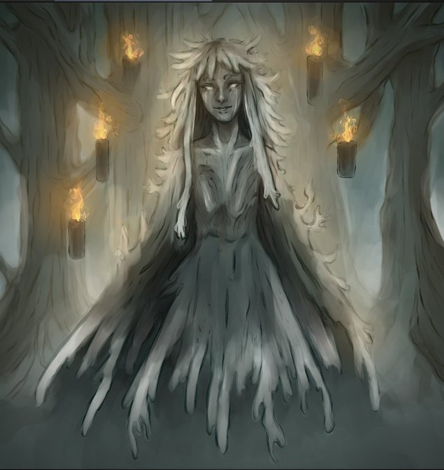 Last one for week one.She lives in the dark part of the forest and wanders around in the dark with her makeshift candles made from the growths on her head. Trespassers that cross her path are rarely seen again