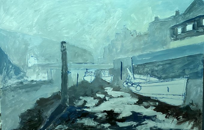 #Staithes win the day! Took a lot of time to draw out so dark by the time I was under painting, hence the greenish tinge from the ‘daylight’ bulb. Misty morning in Staithes Beck. No idea if this will work in #caseinpaint