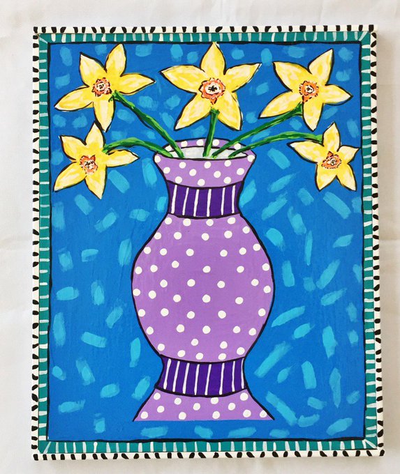"Daffodils in the Purple Urn." Painted on #salvagedwood collected from the streets of #CharlestonSC. #Art #Painting