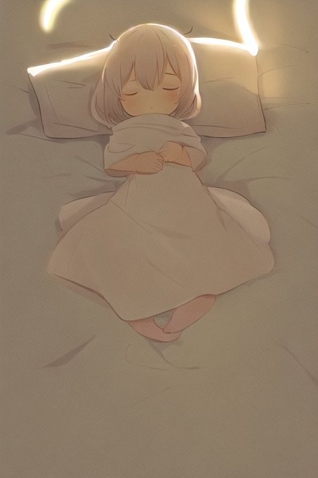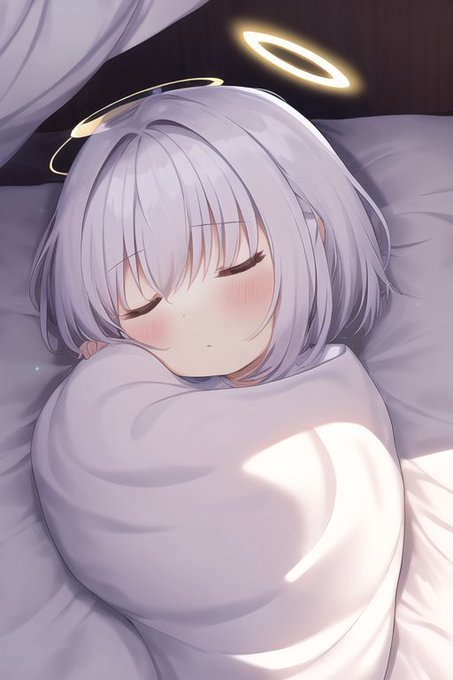 @WhiteRICEsub little angel with halo and short white hair,closed eyes,sleeping,comforter