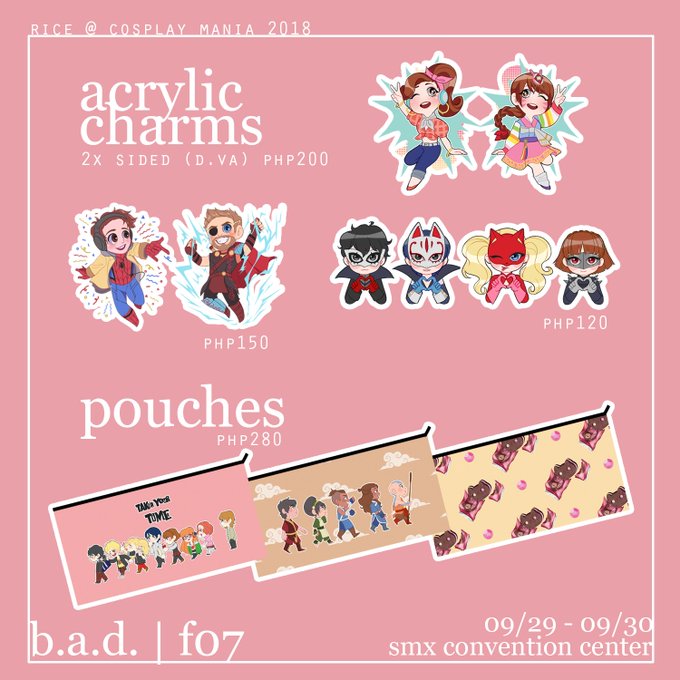 i'll be tabling with my friends from B.A.D. (@wemakebadart) at #CosplayMania2018! here's the stuff i'll be selling 🤟 check out my friends' stuff too! ➡️ @qtbatooty_ @art_roms @elleisonline @meisosoup @_mgsthetic @kaninrice @katsugenki