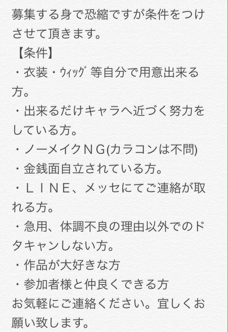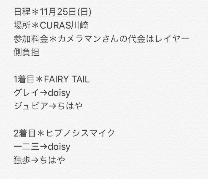 11月25日(日)にCURAS川崎のスタジオにてFAIRY TAILのグレイジュビアとヒプノシスマイクの一二三独歩をやるにあたりカメラマンさん1名募集しております。衣装は画像の通りです。日にちが迫っており大変難しいとは思いますが募集条件をお読みの上ご連絡ください。