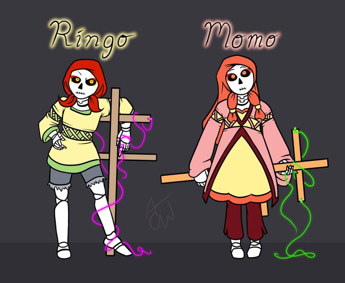 Anyway, Ringo 'n Momo. Apple n Peach Marionettes (they're darkners so their object forms are made from wood from their respective fruit trees)