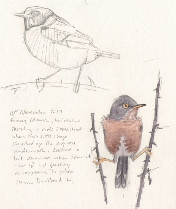 This mornings Dartford Warbler, Ferry Marsh #wildwivenhoe climbed up dogrose as I sketched the Stonechat @EssexBirdNews @BirdGuides @swlanaturaleye