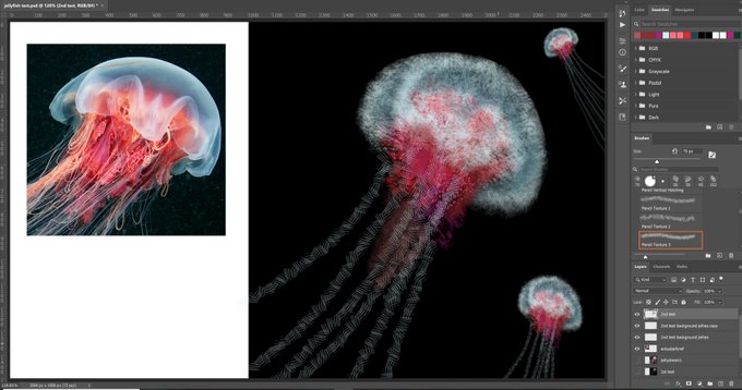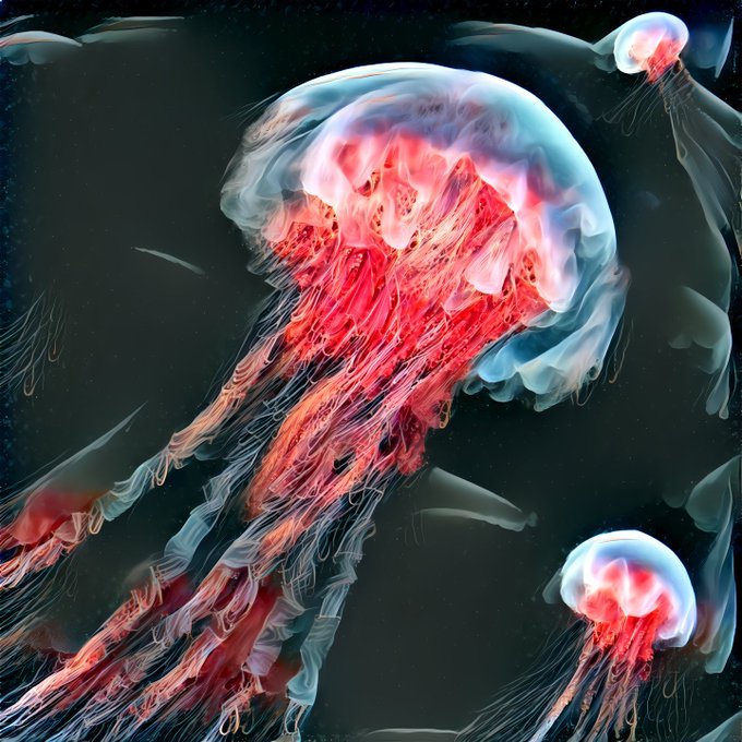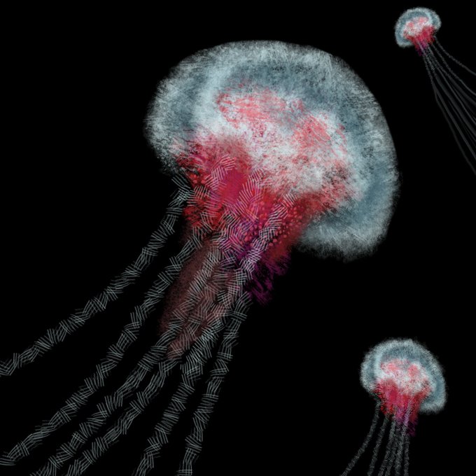 ~Three Jellyfish~ an experiment with #AI #DeepStyle. 1st image raw output from https://t.co/S9KQ0rVXuA (DeepStyle v.2), 2nd is the base image (my quickpaint) , 3rd image shows process of quickpaint using jellyfish reference image, same jellyfish ref used as style image for AI run
